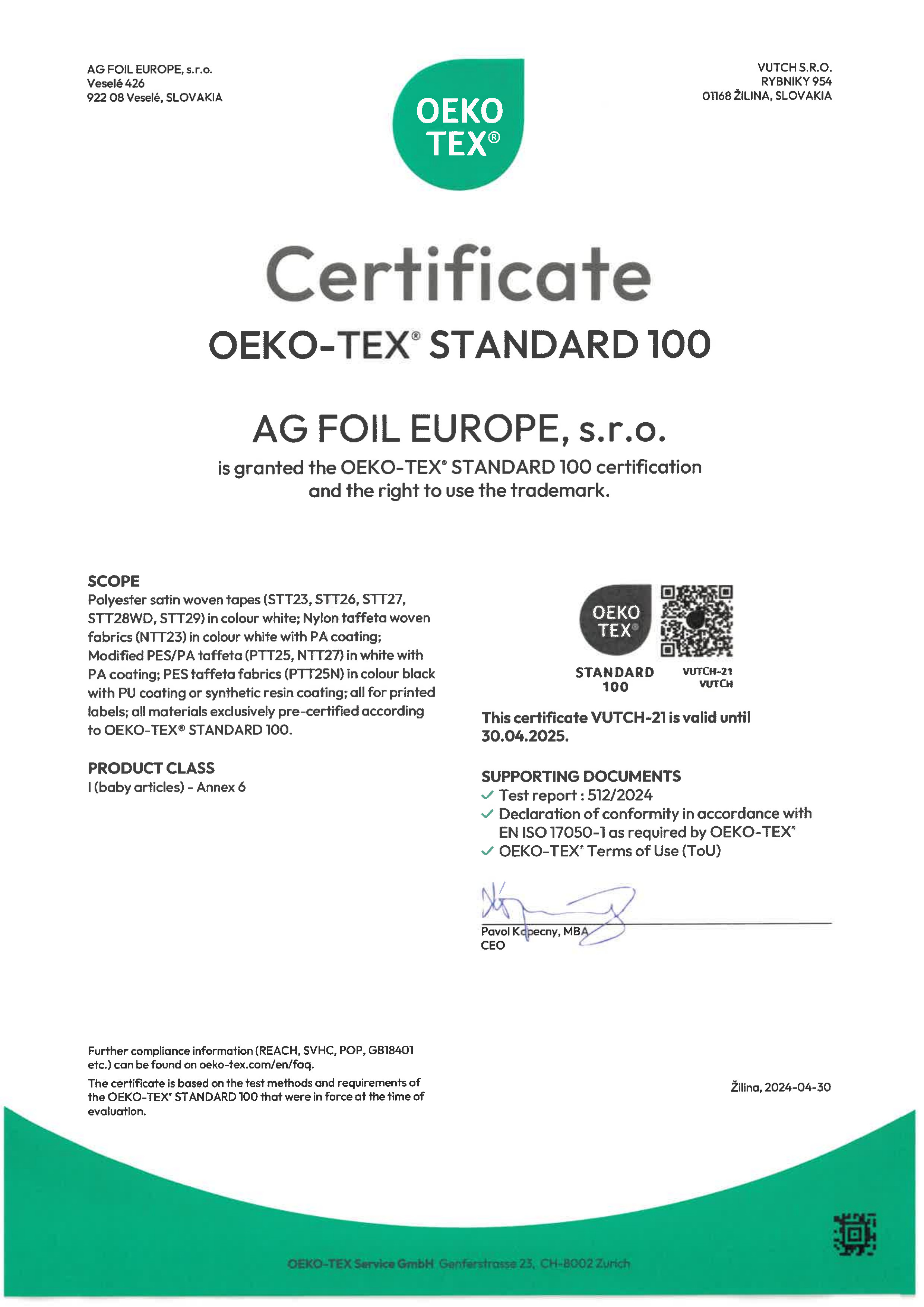 AG FOIL EUROPE s.r.o. is pleased to announce, as one of few companies in Europe, that we have Oeko TEX® Standard 100, Class I. certificate for Thermal Transfer ribbon – AGT85.